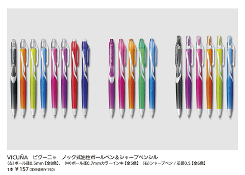 新超低粘度油性ボールペンVICUNA(ビクーニャ)0.5mm 1本 150円+消費税 インキ色 黒・赤・青 軸色 全8色 (黒インキ 6軸色、赤インキ、青インキ) ブラック・オレンジ・イエローグリーン・ピンク・スカイブルー・パープル(黒インキ) レッド(赤インキ)・ブルー(青インキ) 新超低粘度油性ボールペンVICUNA(ビクーニャ)0.7mmカラーインキ 1本 150円+消費税 インキ色 緑・橙・桃・水色・紫 軸色 全5色 グリーン(緑インキ)・オレンジ(橙インキ)・ピンク(桃インキ)・スカイブルー(水色インキ)・パープル(紫インキ (ビクーニャ)シャープペンシル 1本 150円+消費税 芯径 0.5 軸色 全6色 ブラック・オレンジ・イエローグリーン・ピンク・スカイブルー・パープル | |